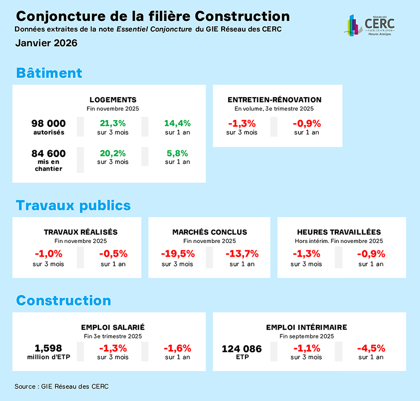 Dans sa note de janvier 2026 sur la conjoncture de la filière construction, le réseau des CERC révèle une situation contrastée et incertaine.