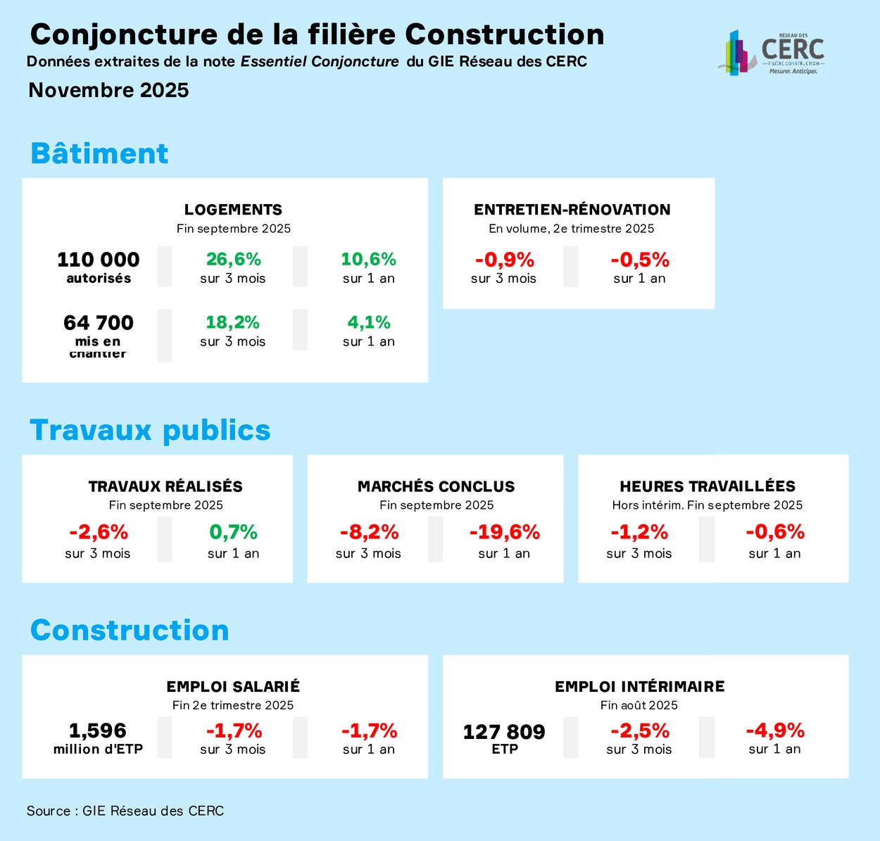 Dans sa note de novembre 2025 sur la conjoncture de la filière construction, le réseau des CERC confirme la bonne orientation à court terme dans la construction neuve et un léger mieux sur les créations et défaillances d’entreprises, mais la situation demeure disparate dans les travaux publics et l’emploi reste en berne.