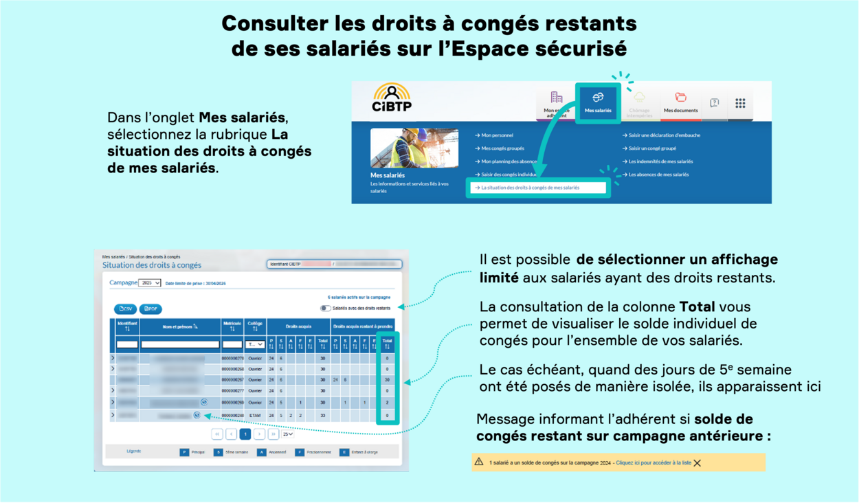 La caisse vous adresse à plusieurs reprises au cours de l’année des courriers d’information reprenant la situation des droits à congés de la campagne en cours de vos salariés. Suivre les droits restants en cours de campagne, c’est vous permettre d’anticiper et de gérer vos plannings d’absence pour optimiser votre organisation interne.